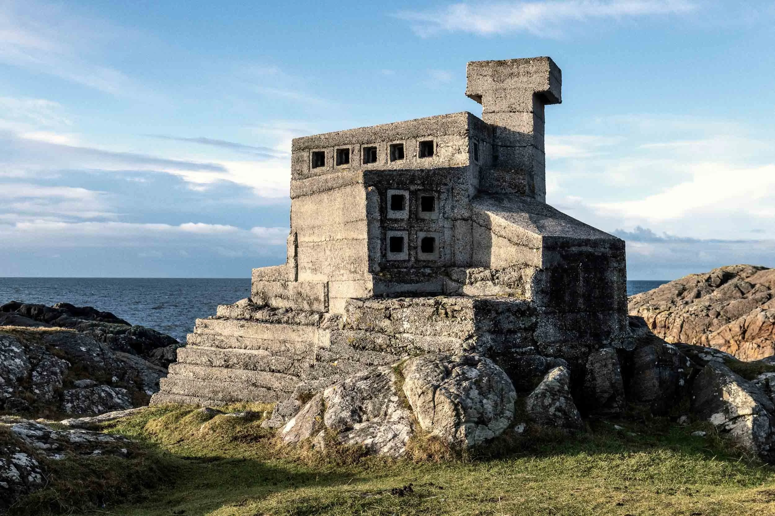 The bay was looking uninteresting as the tide was at full height so we went to find the Hermit’s Castle that’s built on one of the headlands. Ignoring the sign advising of three aggressive tups with a tendency to attack (we noted not to turn our backs on them if they approached) we climbed over the fence and struck off in what we hoped was the right direction. The ‘castle’ isn’t that easy to spot since it blends in with the landscape as “the form and material…harmonise with both stoney Assynt and the Minch spreading below” (Beaton 1995) but we found it pretty quickly. It’s a strange little building. The Buildings at Risk Register describes it as an “[I]n-situ poured concrete folly constructed in 1950 by David Scott, and English architect who left the area shortly after completion. Free form and expressionistic, the glass windows and door have been lost.”